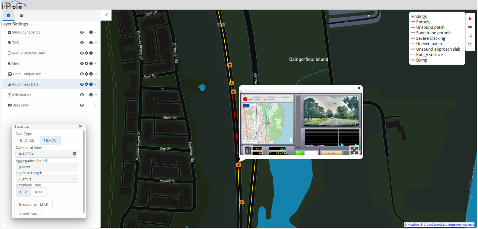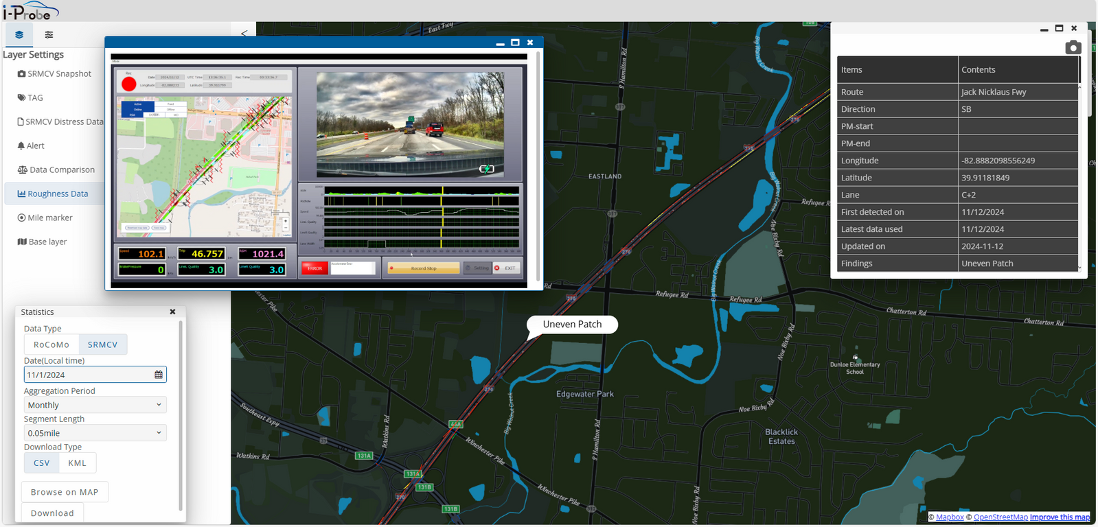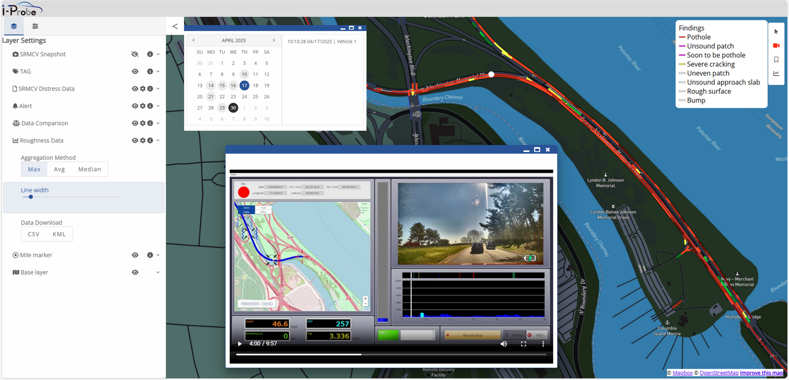 i-Probe's Smart Road Monitoring Connected Vehicle (SRMCV) provides road management agencies a user-friendly, easily-deployable tool for road condition monitoring. It is designed to provide agencies with fast and more frequent data collection capability and rapid output turnaround time compared to traditional methods and without the constraints of outsourcing services.